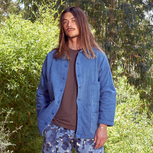 Cloud Camo Shirt Jacket, Indigo Screen Printed Organic Cotton Canvas